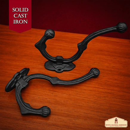 Crafted from solid cast iron using traditional techniques, these hooks feature a weather-resistant oil-blackened finish, making them suitable for both indoor and outdoor use. Whether you're furnishing a Victorian, medieval, steampunk, or gothic space, these hooks add a touch of history to any setting.