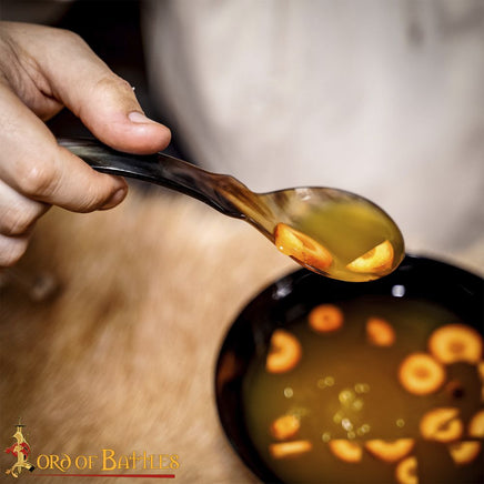 Made from cow horn this spoon is deep enough to enjoy your stew fresh from the cauldron. Feast like a Viking Norseman, Norman Conqueror or Medieval minstrel at your next historical re-enactment, Renaissance or SCA event with this horn spoon.
