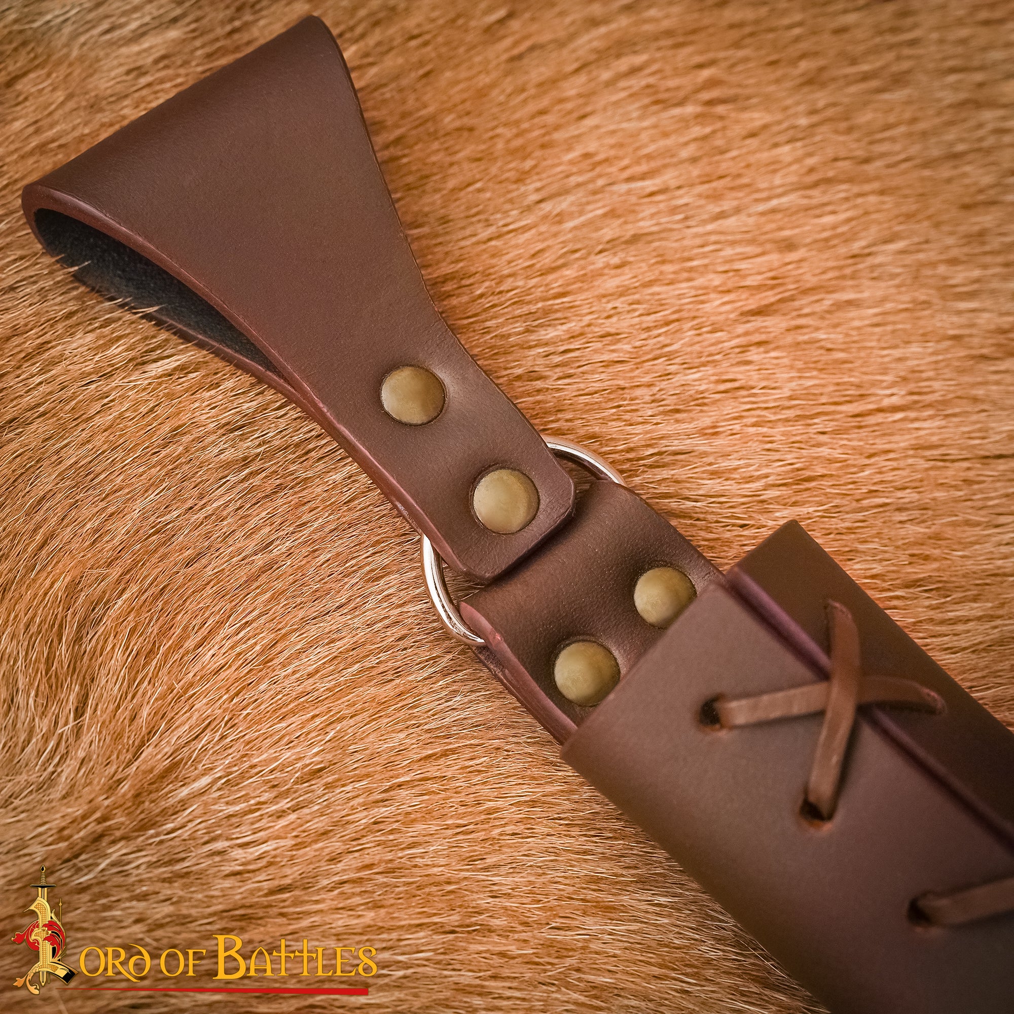 A brown leather sword holder or frog great for your next SCA, LARP, cosplay, Medieval or Viking festival or event. Unlike some smaller holders on the market, this frog can be adjusted to hold scabbards or LARP swords. The frog is made from quality leather with two D shape rings and riveted so it will last your journey.