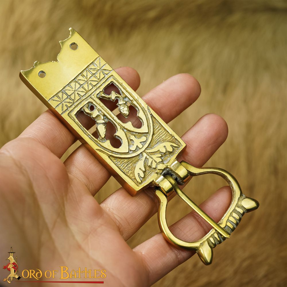 This belt buckle is reproduction of an original 14th - 15th century London find. The buckle is suitable for strap ends 30mm wide. The buckle has four solid brass posts on the reverse and includes four washers. The buckle measures 10.5cm in length and is 4cm wide.