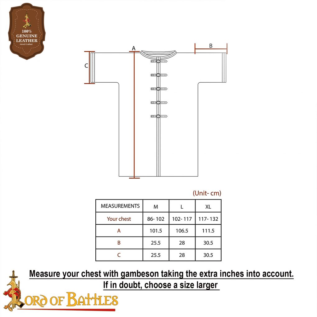 For the best fit, please ensure you are wearing all protective clothing and padding before taking measurements. This product is manufactured by Lord of Battles who support fair working conditions and equal employment opportunities.